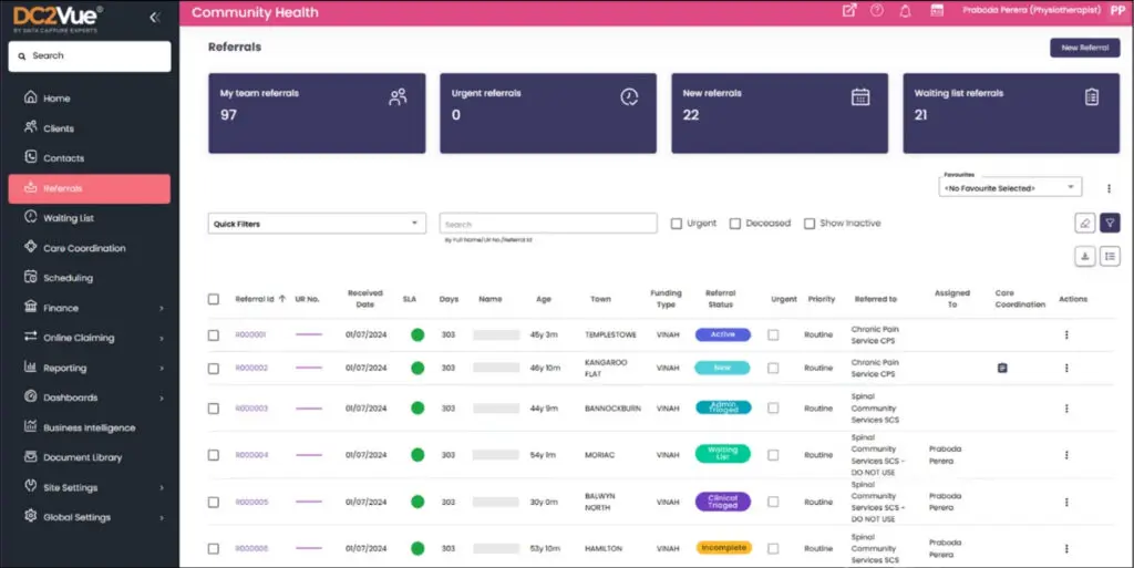 The DC2Vue Referral Dashboard provides a real‑time, centralised view of referral flow across the organisation. Referrals captured from multiple channels whether internal, external, clinical, or administrative; all are consolidated into a single operational workspace. This enables teams to track referral status from initiation through triage, acceptance, scheduling, and completion.