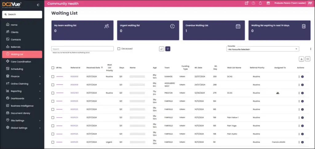 By centralising waitlist information, DC2Vue provides operational teams with clear insight into backlog size, expected wait times, and service demand trends. This supports proactive capacity planning and enables informed decisions about resource allocation, service expansion, or demand redistribution.