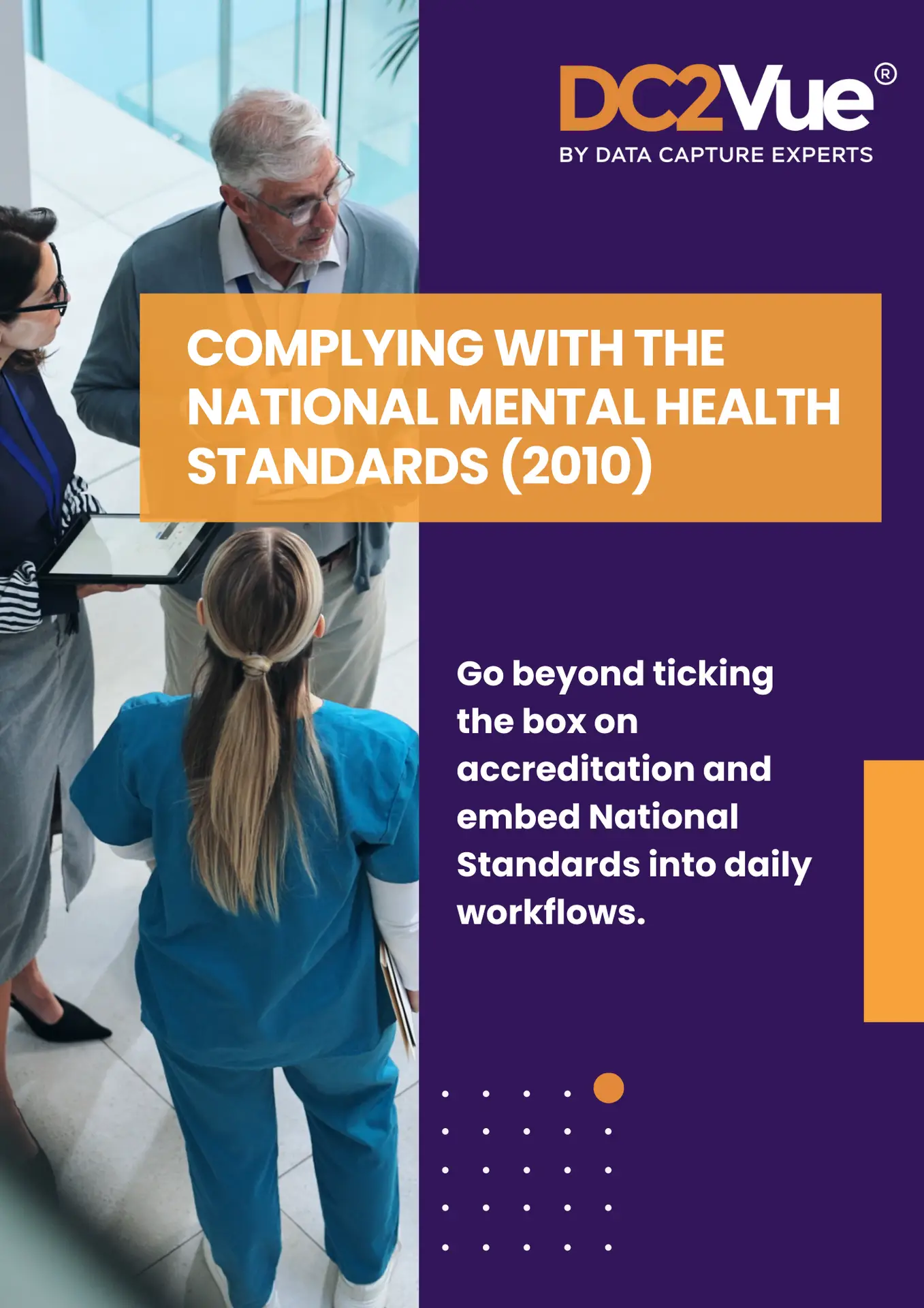 This eBook is your essential guide to understanding and applying the National Mental Health Standards (2010) in a practical, meaningful way. Rather than treating these standards as a compliance checklist, you will learn how to embed them into everyday workflows to create safer, more connected, and recovery-oriented services. Inside, you will find clear explanations of all 10 standards, actionable strategies for improving governance and care delivery, and real-world examples of how digital health platforms like DC2Vue can streamline processes, enhance consumer participation, and support cultural responsiveness. Whether you are a clinician, administrator, or healthcare professional, this resource will help you transform compliance into quality care that truly makes a difference.