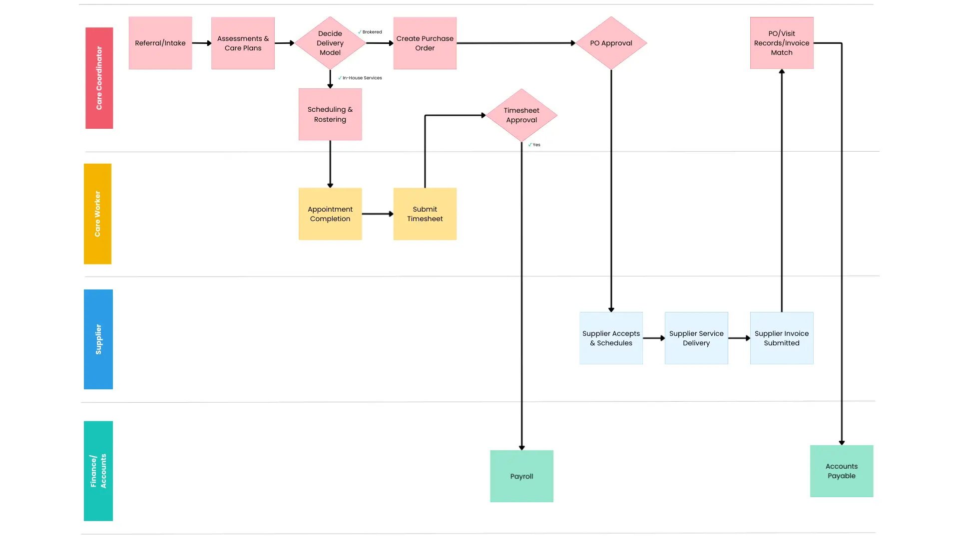 For brokered providers and suppliers, a CMS should generate POs (or PO-like authorisations) automatically from the care plan/service schedule: